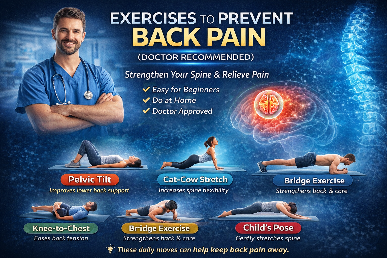Back pain can often be prevented with simple daily habits and regular exercise. These doctor-recommended movements help strengthen your spine, improve flexibility, and keep pain away.